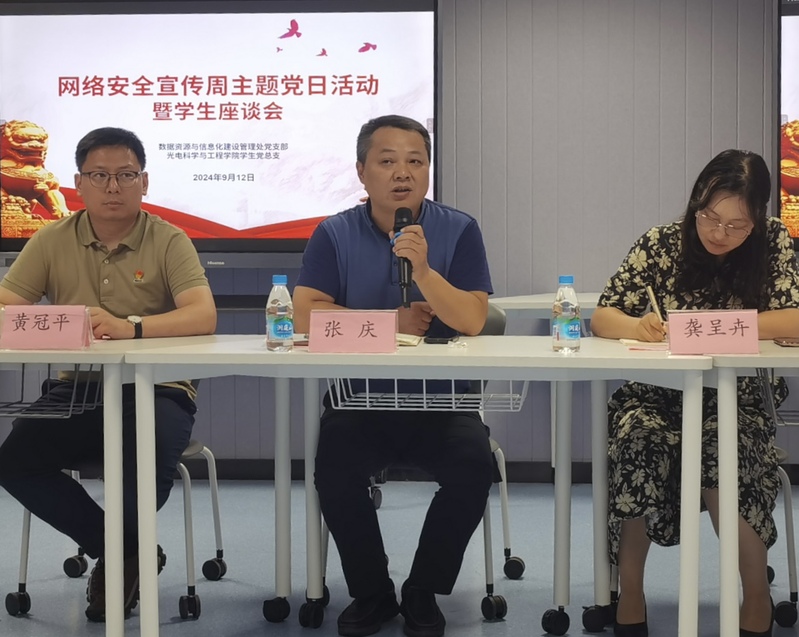 2024年9月12日下午,威尼斯人 学生党总支与校数据资源与信息化建设管理处党支部联合开展网络安全宣传周主题党日活动暨学生座谈会。校数据资源与信息化建设管理处党支部书记张庆,威尼斯人 党委书记龚呈卉,党委副书记、副院长黄冠平,以及教师党员、学生党员代表参加了本次活动。活动由研究生辅导员黄彦龙主持。